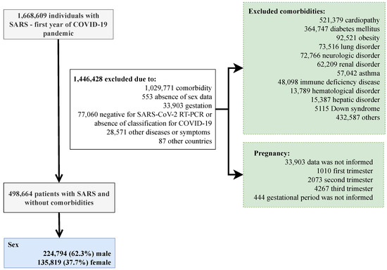Flowchart demonstrating participants’ inclusion in the study. SARS, severe acute respiratory syndrome; COVID-19, Coronavirus Disease 2019; RT-PCR, real-time polymerase chain reaction. After exclusion, all participants had information about their sex and age groups. In order to tease apart the unique effect sex has on the outcomes of COVID-19, we excluded patients with comorbidities such as cardiopathy, hematologic disorder, Down syndrome, hepatic disorder, asthma, diabetes mellitus, neurological disorder, systemic arterial hypertension, chronic respiratory disorders, immunosuppressive disorder, renal disease, obesity, and others (excluding the previous ones).