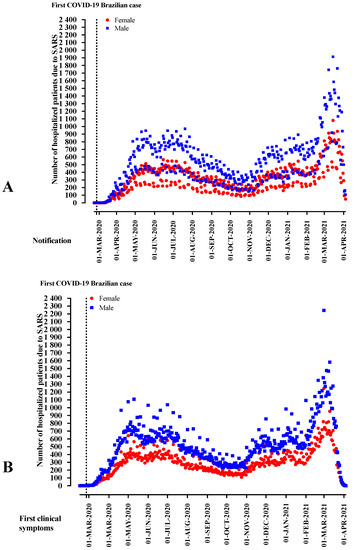 According to the SARS surveillance, the Brazilian Health Ministry input the data in the OpenDataSUS (https://opendatasus.saude.gov.br/, accessed on 8 April 2021) considering the platform of the Sistema de Informação de Vigilância Epidemiológica da Gripe-SIVEP-Gripe (Influenza Epidemiological Surveillance Information System—SIVEP-Influenza).