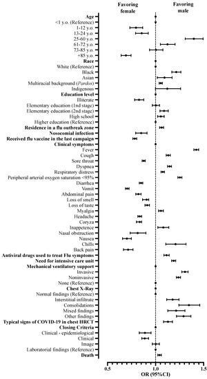 Male patients affected by COVID-19 were more frequently described as 25–60 years old (OR = 1.398; 95%CI = 1.308–1.495) and 61–72 years old (OR = 1.124; 95%CI = 1.050–1.203) when compared to female patients. However, there were fewer male patients in the age groups 1–12 years old (OR = 0.796; 95%CI = 0.732–0.866), 13–24 years old (OR = 0.856; 95%CI = 0.792–0.924), and +85 years old (OR = 0.692; 95%CI = 0.642–0.745) when compared to patients aged below one-year-old. Regarding race, the number of male patients, when compared with female patients, was higher in the following groups: Black (OR = 1.215; 95%CI = 1.169–1.264), Asian (OR = 1.093; 95%CI = 1.018–1.172), and Pardos (multiracial background; OR = 1.054; 95%CI = 1.037–1.071) using as a reference the White race. Patients that had completed elementary school (2nd stage) (OR = 1.088; 95%CI = 1.046–1.132) and those that completed high school (OR = 1.055; 95%CI = 1.021–1.090) were more frequently men, while illiterate patients (OR = 0.828; 95%CI = 0.782–0.877) presented lower numbers when compared to those that completed higher education. Men outnumbered women residing where a flu syndrome outbreak occurred (OR = 1.063; 95%CI = 1.042–1.083) (Table 1; Figure 2).