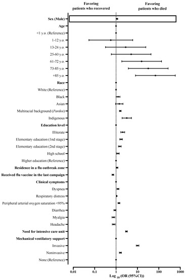 The multivariate analysis predicted death risk (p-value < 0.001; Nagelkerke R2 = 0.406), and male sex was one of the factors associated with this risk (OR = 1.101; 95%CI = 1.011–1.199), however, with a small effect size. In addition, other factors also contributed as death predictors such as older age (61–72 years old (OR = 15.778; 95%CI = 1.865–133.492), 73–85 years old (OR = 31.978; 95%CI = 3.779–270.600), and +85 years old (OR = 68.385; 95%CI = 8.164–589.705)), race (Black (OR = 1.247; 95%CI = 1.016–1.531), Pardos (multiracial background; OR = 1.585; 95%CI = 1.450–1.732), and Indigenous peoples (OR = 3.186; 95%CI = 1.927–5.266)), schooling (illiterate (OR = 2.066; 95%CI = 1.682–2.538), initial years of elementary school (1st stage) (OR = 1.728; 95%CI = 1.496–1.997), final years elementary school (2nd stage) (OR = 1.497; 95%CI = 1.292–1.736), and high school (OR = 1.232; 95%CI = 1.076–1.411)), residing in an area where an Influenza syndrome outbreak occurred (OR = 1.113; 95%CI = 1.013–1.222), clinical signs (dyspnea (OR = 1.231; 95%CI = 1.110–1.365) and peripheral arterial oxygen saturation < 95% (OR = 1.367; 95%CI = 1.238–1.508)), need for admission in ICU (OR = 3.069; 95%CI = 2.789–3.377), and need for ventilatory support (invasive (OR = 10.174; 95%CI = 8.803–11.759) and noninvasive (OR = 1.609; 95%CI = 1.438–1.800)) (Supplementary Materials Table S4; Figure 4).