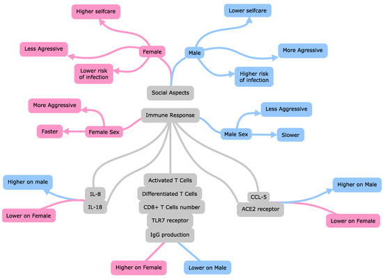 The innate immune can respond to the difference in phenotype among patients with COVID-19 due to the fact of interferons’ (IFNs) action, which limits the viral infection, starts the tissue repair, and programs the adaptive immune system to eliminate the pathogen [5]. Adult women develop a fast and aggressive innate and adaptive immune response to combat the invading pathogens, while men show an attenuated immune response and are more susceptible to viral infections, since elements of the response to androgens and estrogens reside in several genes of the innate immunological system [5]. A study carried out by Takahashi et al. (2020) reported a more significant increase in interleukin (IL)-8 and C-C motif chemokine ligand 5 (CCL5) during COVID-19 development in men when compared to women. The same study evidenced that those female COVID-19 patients presented a higher number of activated T cells, differentiated from those in male patients, mainly CD8+ T cells [6]. Moreover, the Toll-like receptor (TLR)-7 is located in dendritic cells and responds to viral RNA. The gene responsible for the TLR-7 expression is located in the X chromosome and has higher expression in women. The hormonal factor cannot be disregarded, since the androgens are immunosuppressors and reduce the presence of the Toll-like receptor (TLR)-4 in macrophages, reducing the propensity to activate the innate immune response [7]. In addition, angiotensin-converting enzyme 2 (ACE2), which is necessary for SARS-CoV-2 to enter the cells, had its activity increased by male sexual hormones in an animal model [5,8].