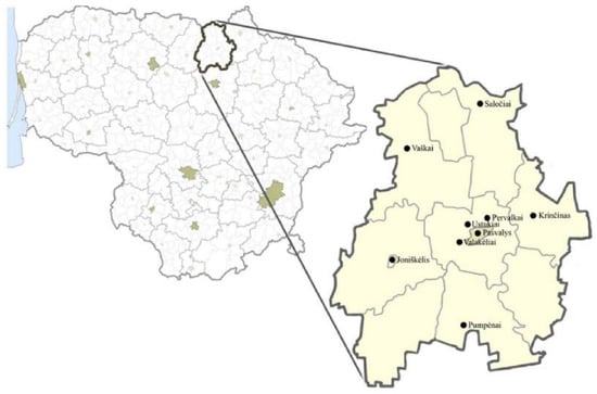 The area of the Pasvalys district is 1289 km2, which makes up 2% of the total area of Lithuania. According to the data provided in 2020, there were 22,816 inhabitants in the Pasvalys district. There are two big towns in the district, Pasvalys and Joniškėlis; seven smaller towns, Daujėnai, Krikliniai, Krinčinas, Vaškai, Pumpėnai, Pušalotas, and Saločiai; and 398 villages [21]. Most of the population lives in villages and towns, which is why people tend to be treated with natural substances for mild diseases. Figure 1 shows the territory of the Pasvalys district, and the black circles indicate locations where the survey was conducted.
