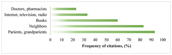 It was very important to prove the authenticity/reliability of the knowledge gathered during the study. The structured interview asked respondents where they had gained the knowledge about traditional medicine, the use of medicinal plants, and how they had learned to treat with the help of natural substances. The results on the sources of information obtained during the study are presented in Figure 2.