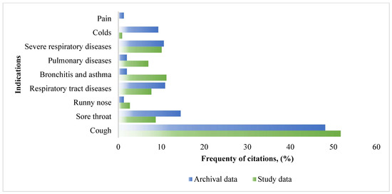 The main indication for use was cough, as shown by the overall study data (Figure 3). From the data of the study, we can see that the respondents most often used herbs to relieve symptoms such as cough and shortness of breath (dry cough, severe cough attacks, shortness of breath), and such responses accounted for 51.70% of all citations. The use of herbs that relieve cough mostly intended to remove the secretion from the lungs and thus facilitate expectoration. In second place, subjects used herbs for bronchitis and asthma, accounting for 11.20% of all citations. Severe respiratory and organ diseases such as lung cancer, whooping cough (pertussis), various forms of tuberculosis, and angina accounted for 10.10% of all citations. Comparing the indications for use with the archival data, it was observed that cough and dyspnea were the main symptoms that subjects rushed to treat with the help of medicinal plants.
