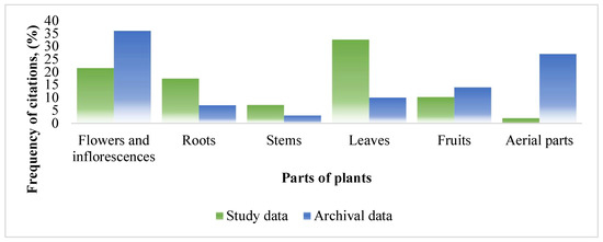 Different parts of the plant (leaves, roots, flowers, or fruits) have different active ingredients, which can make one part of the plant toxic and the others beneficial to health. Phytotherapy may use the whole plant or only a part of the plant [30]. The parts of medicinal herbal raw materials and their use distribution are shown in Figure 4. According to the data of the study, we can see that leaves were the most frequently chosen part of the plan (32.60% of the citation frequency), while in the archival data, the leaves accounted for only 10% of the citation frequency. Flowers and inflorescences were very popular both in the study and in the archival data. In the study, they accounted for 21.50% of the citation frequency, and in the archival work, as much as 36% of the citation frequency. Respondents stated that leaves and flowers were the easiest to apply in traditional medicine. In the archival data, the whole plants were used very often (27% of the citation frequency), but in the study conducted in the Pasvalys district, the use of whole plants was not often mentioned (only 2% of the citation frequency). The roots accounted for 17.40% of the citation frequency in the Pasvalys study and 7% in the archives.