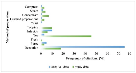 According to the research, medicinal plants are prepared as various pharmaceutical forms such as teas (herbs are added to boiling water), decoctions (herbs are boiled), and infusions (raw material is added to alcohol or vodka and left to extract), poultices (a cloth for poultice is soaked in decoction), and ointments (substances of plant origin and of animal origin are mixed). The preparation methods for the treatment of respiratory diseases and data from the archival sources are compared in Figure 5.