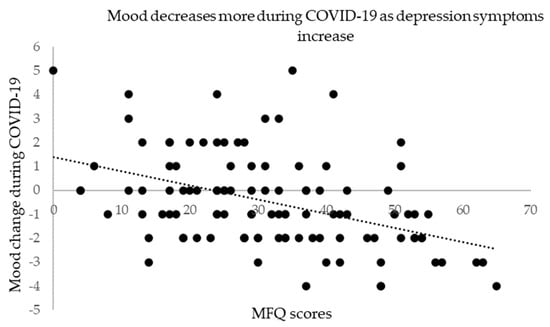 We performed Spearman’s correlation test to assess the relationship between depression symptoms (MFQ) and the 4 quantitative survey responses. Results of p ≤ 0.01 were considered significant to control for multiple comparisons. Consistent with our between-group analysis we found a statistically significant positive correlation between internet use change during COVID-19 and MFQ scores, (rs = 0.34, N = 108, p < 0.001, two-tailed, see Figure 2) that is those with higher depression symptoms reported using the internet more during COVID-19. We also found using a Pearson’s correlation test that those with higher depression symptoms had a greater decrease in mood during COVID-19 (r = −0.44, N = 108, p < 0.001, two-tailed, see Figure 3).