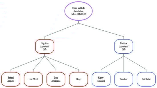 For the theme, mood and life satisfaction before COVID-19, two sub-themes emerged: positive and negative aspects. Freedom and happiness were further positive sub-themes and school anxiety, low mood and being busy negative sub-themes (see Figure 5).