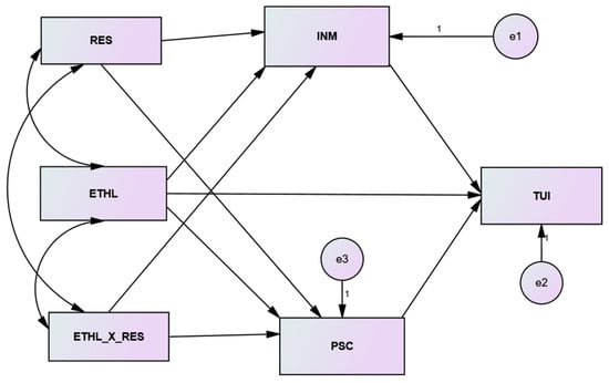 The hypothesized relationships were tested by using structural equation modeling (SEM). The AMOS software was used for a complex second-generation multivariate data analysis solution for a covariance-based SEM . Along with AMOS, we also sought the guidance from the PROCESS plugin in SPSS []. This plugin enables data analysts to calculate different paths through differential equations. For this purpose, a model 7 formula was followed to build a user-defined syntax in the AMOS interface. Prior to this stage, we converted ETHL and RES into mean-centered variables, which is especially recommended for a model which includes moderating variables. After obtaining the mean-centered variables (ETHL and RES), we developed an interaction term (ETHL_X_RES) to produce an effect on two mediators (INM and PSC). Bootstrapping was also enabled by using a larger bootstrapping sample of 5000 []. The output of this analysis is given in Table 6, which shows different relationship values extracted from AMOS. It was noted that ETHL negatively predicted TUI, which is in line with the theoretical statement of H1. Specifically, it was noted that ETHL reduces the TUI of employees, indicating that H1 of this study should be accepted based on statistical evidence. The same type of argument may be repeated to infer that the statistical data also support the theoretical statements of H2 and H4.