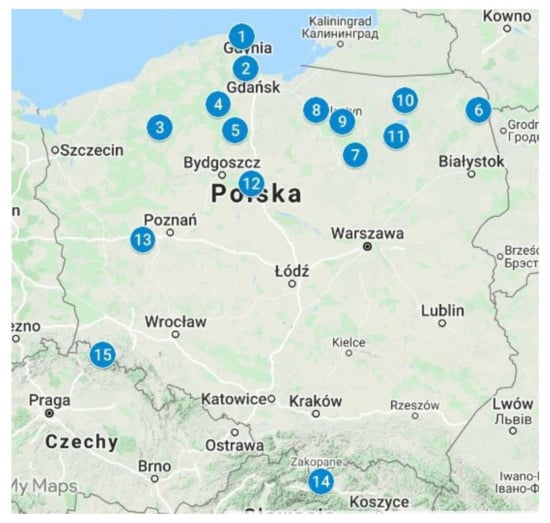 Sampling locations of King Bolete [(id1) Seacoast Landscape Park; (id2) Tricity Landscape Park, Osowa; (id3) Pomerania, Szczecinek; (id4) Wdzydze Landscape Park; (id5) Tuchola Pinewoods; (id6) Augustów Primeval Forest; (id7) Warmia land, Puchałowo; (id8) Warmia, Morąg; (id9) Warmia, Olsztyn; (id10) Mazury, Giżycko; (id11) Mazury, Piska Forest; (id12) Kujawy, Toruń forests; (id13) Greater Poland, Porażyn; (id14) Tatra Mountains; (id15) Sudety Mountains, Kłodzka Dale] (see also Table 1).