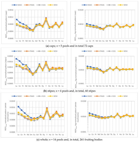 Figure 2 displays the North American Shale Composite (NASC) and Post—Archean Australian Shales (PAAS) and the European Shale (EUS) and World Shale (WSH) REE and Y (REEY) normalized (normal and log-normal) patterns in the caps, stipes, and the whole fruiting bodies of B. edulis based on the median concentration values as well as results for the Augustów (id6) and Morąg (id8) sites and for a specimen examined/reported by Bau et al. [,]. Details of the data, including the REE-normalized patterns are presented in the Supplementary Materials (Figures S1–S4 and Tables S1 and S2). These normalized distributions of REEY in samples of B. edulis showed minor differences in patterns between some of the sites. REE Sc and Y, as non-essential elements, are considered to be co-absorbed by the mycelium alongside Ca and accumulation patterns in mushrooms more or less follow the natural pattern in soil substrata. Thus, some of the detectable differences in the normalized pattern could potentially be reflecting the local soil for a given REE(s).