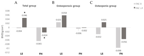 Changes in absolute BMD according to FAC: (A) total group; (B) osteoporosis group; (C) osteopenia group. Abbreviations: LS, lumbar spine; FN, femoral neck; FAC, functional ambulatory category; * p < 0.05 was analyzed by independent t-test.