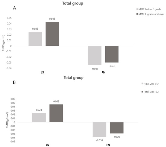 Changes in absolute BMD according to MMT and MBI: (A) comparison according to MMT; (B) comparison according to MBI. Abbreviations: LS, lumbar spine; FN, femoral neck; MMT, manual muscle test; MBI, modified barthel index.