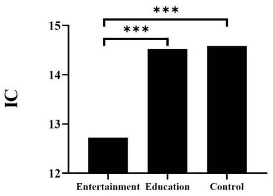 For IC, the main effect of age was significant (F(3,114) = 28.93, p < 0.001. η2 = 0.43). Post-hoc Bonferroni tests showed that the scores of the four- and five-year-old groups were significantly lower than those of the seven-year-old group (p < 0.001), and the other differences between the groups were non-significant. The main effect of animation type was also significant (F(2,114) = 13.22, p < 0.001, η2 = 0.96). Post-hoc Bonferroni tests showed that children in the entertainment group scored significantly lower for IC than those in the educational and control groups (p < 0.001). There was no difference in IC between the educational and control groups (p > 0.05; Figure 1).