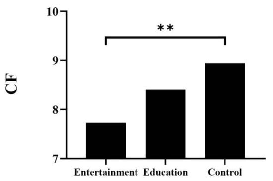 For CF, the main effect of age was significant (F(3,114) = 18.05, p < 0.001, η2 = 0.18). The post-hoc Bonferroni test indicated that the scores of the four-, five-, and six-year-old groups were significantly lower than those of the seven-year-old group (p < 0.001), and the difference between the other groups was non-significant (p > 0.05). The main effect of the animation type was significant (F(2,114) = 4.66, p = 0.01, η2 = 0.08). The post-hoc Bonferroni test showed that children’s CF scores were significantly lower in the entertainment group than in the control group (p < 0.01) and that the other differences between the groups were non-significant (p > 0.05; Figure 2).