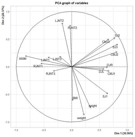 According to Figure 1, that indicators LJNT 2 and RJNT 2 are the most representative of Dim2. Table 2 reveals that LJNT 2, RJNT 2, SJ 2, CMJ 3, and the height and weight of the samples were significantly correlated to Dim2. The indicators above measure flexibility, as discussed in the aforementioned literature, thus, Dim2 represents flexibility. Height and weight have significant negative correlations with flexibility.