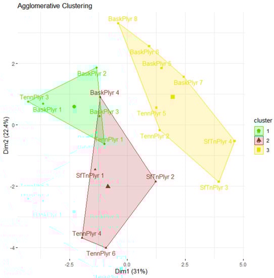 As shown in Figure 2 and Table 3, the first group (green) was composed of six samples, and the coordinates of the centroid were (−2.4, 0.8); the second group (red) was composed of four subjects, and the centroid was at (−0.3, −2); the third group (yellow) consisted of eight samples, and its centroid coordinates were (2.3, 0.9). Figure 2 shows that after agglomerative clustering was performed, the native groups of basketball, tennis and soft tennis players are clustered into the new three clusters of “strength” by Cluster 1, 2 and 3 (Figure 2). For example, Cluster 3 (yellow) has the largest number of tennis players and it indicates the strongest tennis “strength”. Thereafter, Cluster 1 and Cluster 2 are to be interpreted similarly.