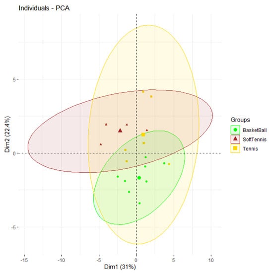 A total of 18 test indicators, which comprise of 15 indicators mentioned in the aforementioned literature as well as the height, weight, and BMI of the subjects, were used to distinguish between the respective sports of the samples. Scatter plots to describe the relationship between samples were not possible, due to a large number of indicators; therefore, PCA was performed to reduce the dimensionality of the large data set. The PCA results for the performance of the 18 samples in the 18 indicators are shown in Figure 1 [29,30].