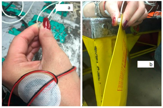 In the final phase, the workers were then asked to keep two kinds of envelopes, weighing 100 g and 500 g, raised in a pinch grip with the load cell placed between the envelope and the thumb to record the force (Figure 1b); during the test, the force was exerted with the forearm resting on a table, thus isolating only the functional muscular work required to pinch the envelopes.