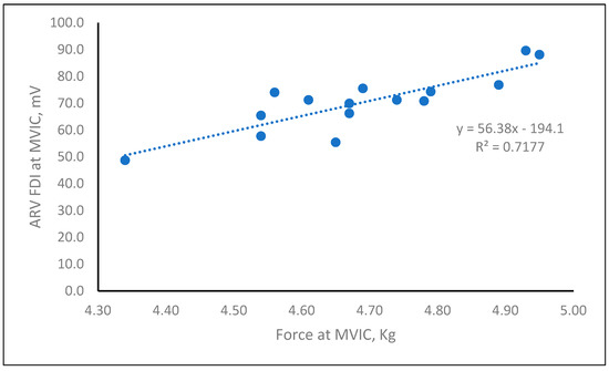 Figure 2 shows the positive linear regression between FDI ARV (dependent variable) values and force at MVIC as independent variable (R² = 0.71, p < 0.001); R-squared, the coefficient of determination, measures the strength of the linear relationship between the independent variables X in the regression model and the dependent variable Y. The equation of the regression line is also shown in the box of Figure 2.