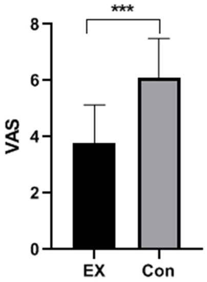 Figure 1. The score of VAS on evaluating subjects’ craving degree for mobile phones. Note: Ex: the exercise group; Con: the control group; VAS: visual analog scale. *** p < 0.001.