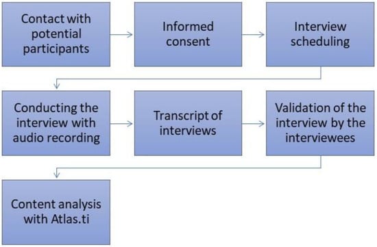 Each interview was transcribed in full, and its transcript was sent to the interviewee for validation (Figure 1). The content analysis was developed with thematic analysis [19], which defines three phases: preanalysis, exploration, and finally, the treatment of results and interpretation [19]. In the exploratory analysis, common contents were searched for, which allowed the identification of thematic areas designated by categories. Atlas.ti®software was used in the coding and categorization of the interviews. We used this software to create the units of analysis (categories) and identify them from the significant excerpts of the interviews that were grouped into large thematic areas (families), which enabled the obtain of the results of this study.