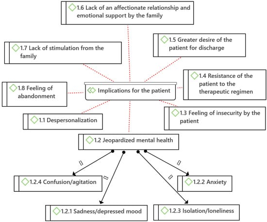 Eight categories and four subcategories were found that were considered consequences for the patient: Depersonalization (1.1), Jeopardized mental health (1.2) with two subcategories: Sadness/depressed mood (1.2.1), Anxiety (1.2.2), Isolation/loneliness (1.2.3), and confusion/agitation (1.2.4), Feeling of insecurity by the patient (1.3), Resistance of the patient to the therapeutic regimen (1.4), Greater desire of the patient for discharge (1.5), Lack of an affectionate relationship and emotional support by the family (1.6), Lack of stimulation from the family (1.7), and Feeling of abandonment (1.8) (Figure 2).