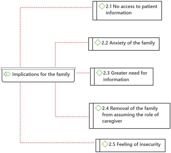 As implications on the family members caused by the policy of restricting visits to hospitalized patients, five categories were identified: No access to patient information (2.1), Anxiety of the family (2.2), Greater need for information (2.3), Removal of the family from assuming the role of caregiver (2.4), and Feeling of insecurity (2.5) (Figure 3).