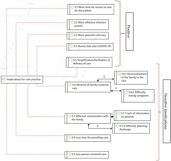 Nine categories were identified as implications for care practice, with four subcategories. Five categories were considered positive implications for care practice: More time for nurses to care for the patient (3,1), More effective infection control (3.2), More peaceful infirmary (3.3), Nurses feeling safer from COVID-19 (3.4), and Simplification/facilitation of care and delivery (3.5). Four categories, with four subcategories, had negative implications for care practice: Absence of family-centered care (3.6) (subcategories: Noninvolvement of the family in the care (3.6.1) and Difficulty training caregivers (3.6.2)), Communication with the affected family (3.7) (subcategories: Lack of information on patients (3.7.1) and Difficulty planning discharge (3.7.2)), Less time for providing care (3.8), and Less person-centered care (3.9) (see Figure 4).