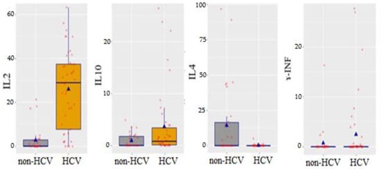 We have tested the levels of cytokines in the OF and found that in the group of patients with HCV, compared with the non-HCV group, the level of pro-inflammatory cytokineIL-2 and anti-inflammatory IL-10 increased and the level of anti-inflammatory cytokine IL-4 decreased. The increase in the level of ɤ-INF in the oral fluid in HCV patients compared with the non-HCV group was insignificant. These findings were consistent with the existing literature; e.g., in their research, Ribeiro C.R.A. et al. (2021) found high serum levels of IL-10, IL-4, IL-2 and TNF-α in HCV patients compared with controls [].