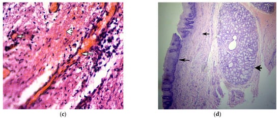 (a) Lymphoplasmocytic infiltration of the lamina propria of the oral mucosa in the patient with HCV. The large bold arrow marks the site of intense lymphoplasmocytic infiltration. Cell identification was carried out at higher microscope magnifications. A thin, long arrow marks the site of incipient sclerosis of the lamina propria. A thin, short arrow indicates a dystrophically altered apex of the acanthotic strand of the epithelial cover (stained with hematoxylin–eosin, ×100). (b) Migration of the cells of the inflammatory infiltrate into the thickness of the epithelial layer of the oral mucosa in the patient with HCV (arrow; stained with hematoxylin–eosin, ×400). (c) A section of the own plate of the oral mucosa in a patient with HCV. There is swelling of the connective tissue with hemorrhages in the thickness of the tissue (thick, short arrow), dilatation and a plethora of capillaries (short and long, thin arrows). Around the longitudinally cut, full-blooded blood vessel, the presence of mononuclear inflammatory cell infiltration is shown (thin, long arrow) (stained with hematoxylin–eosin, ×400). (d). A section of the oral mucosa in the patient with non-HCV. This material served as a control. The bold arrow indicates one of the two intact minor salivary glands with lobular ducts. The long, thin arrow indicates intact stratified squamous nonkeratinized epithelium. The short, thin arrow points to an intact lamina propria composed of delicate bundles of collagen fibers. There is scant to moderate mononuclear inflammatory cell infiltration in the left below part of lamina propria (stained with hematoxylin–eosin, ×100).
