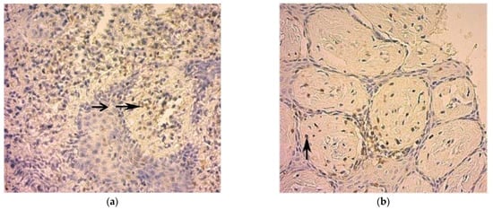 Diffuse lymphocytes in the plate mucous oral membrane are represented mainly by T-cells, though T-lymphocytes were singly localized in the thick epithelial stratum. B-lymphocytes were diffuse in scanty quantity. Single plasmocytes were also scattered in the infiltrate, mainly in the surface part of the mucous membrane under the epithelium (Figure 3a,b).