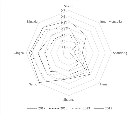 In order to make the radar map presentation clear, we drew a radar map of the non-coordinated coupling degree of each province in the Yellow River Basin from 2010 to 2017 with two years as one period. This was used to analyze the time-series characteristics and influence mechanism of the non-coordinated coupling degree of each province in the Yellow River Basin in combination with the stage division of non-coordinated coupling, as shown in Figure 1.
