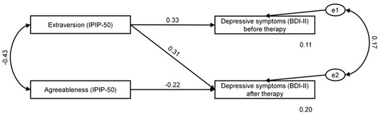 Table 4 shows standardized regression weights for the effects of the personality traits on depressive symptoms before and after therapy. As shown, extraversion had an overall effect on depressive symptoms before therapy (β = 0.331; p = 0.017). In addition, extraversion and agreeableness had an overall effect on depressive symptoms after therapy, but were not significant (β = 0.310; p = 0.068 and β = −0.217; p = 0.134; respectively). The recorded values of predicted variance were 11% for depressive symptoms before therapy and 20% for depressive symptoms after therapy. In general, extraversion was an important predictor of depressive symptoms. That is, patients who scored higher on extraversion were likely to report more depressive symptoms.