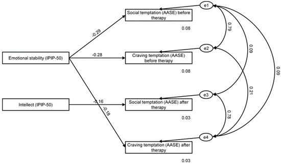 Presented in Table 5 are standardized regression weights for the effects of personality traits on dimensions of self-efficacy before and after therapy. As shown, we found emotional stability to have an overall effect on social temptation and craving temptation before therapy, and craving temptation after therapy (β = −0.291; p = 0.069; β = −0.281; p = 0.079; β = −0.177; p = 0.024; respectively). In addition, intellect was found to have an overall effect on social temptation after therapy (β = −0.159; p = 0.038). Recorded values of predicted variance were 8% and 3% for social temptation before and after therapy, respectively, and 8% and 3% for craving temptation before and after therapy, respectively. In general, emotional stability was an important predictor of craving temptation after therapy. That is, patients who scored higher on emotional stability were likely to score lower on craving temptation after therapy, and participants who scored higher on intellect were likely to score lower on social temptation after therapy.