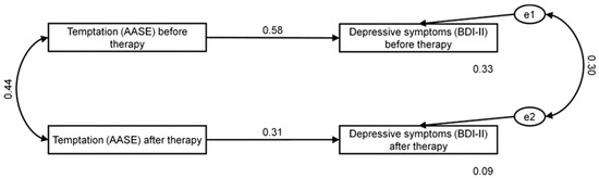 AASE temptation as predictor of depressive symptoms in the investigated group before and after therapy. e1 and e2 depict the error term referring to the dependent variables.
