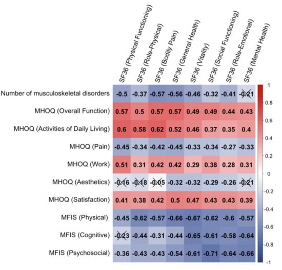 Correlogram representing the Spearman correlation coefficient regarding the number of musculoskeletal disorders, various dimensions related to the hand function (MHQ) and fatigue (MFIS), and the 8 quality of life dimensions of the SF-36 scale. The colour and brightness of each square represent the magnitude and sign of each correlation (red = positive, blue = negative), respectively. The X indicates a nonsignificant correlation (p > 0.05; with Bonferroni–Holm correction).