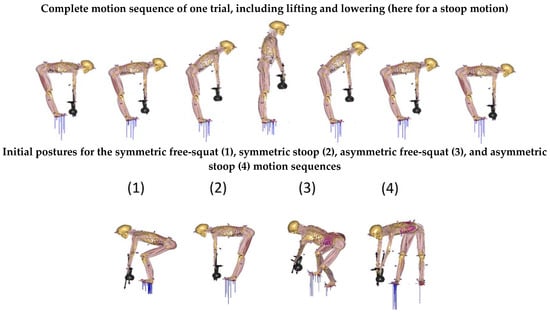 - Van der Have, A.; Rossom, S.; Jonkers, I. Squat Lifting Imposes Higher Peak Joint and Muscle Loading Compared to Stoop Lifting. Appl. Sci. 2019, 9, 3794. [Google Scholar] [CrossRef] [Green Version]