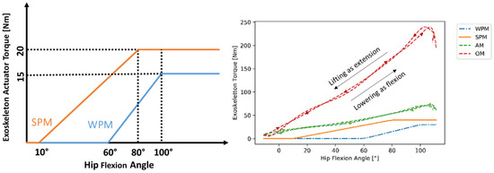 For the passive support modes, the torque was initially zero before reaching a certain hip flexion angle threshold; then, it increased linearly at an angle, until the hip angle reaches a second threshold, after which the torque remains constant. The angle thresholds and the progression rate of weak (WPM) and strong (SPM) passive modes were chosen to approximate the characteristics of the two example variants of existing systems, which can vary in the intensity of applied torque and bending angle offset, to understand potential biomechanical differences between passive variants [29,30].