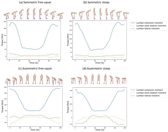 For the symmetric motions, the lumbar axial rotation and lateral moments were relatively small Figure 5a,b compared to the asymmetric ones Figure 5c,d. The free-squat motion technique raises slightly higher extension moments Figure 5a than the stoop technique Figure 5b,d. High lumbar axial rotation moments occurred for the asymmetric motion techniques Figure 5c,d. Especially for the asymmetric stoop, substantial high lumbar lateral moments appeared Figure 5d.