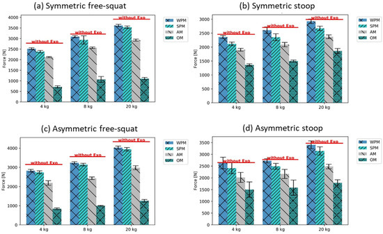 Considering first the load on L4/L5, the OM support mode reduced the peak compression forces the most, followed by AM, SPM, and WPM (Figure 8). This tendency was observed for all motions and loads. Comparing the results for the free-squat (Figure 8a,c) and stoop (Figure 8b,d), when using OM, the peak compression force was lower for the free-squat than for the stoop (mean of sym. and asym. squat: 998 N ± 64 SD; mean of sym. and asym. stoop: 1599 N ± 158 SD), although the opposite was found without exoskeleton support. In contrast, for the three other modes, the peak compression forces remained higher during the stoop than during the free-squat, for both the symmetric and asymmetric motions. The difference in peak compressive force reduction between the WPM and SPM was higher for the stoop than for the free-squat motion technique, independent of the symmetry of motions (mean of L4/L5 peak compression force difference between WPM and SPM, free-squat motions: 102 N ± 31 SD; stoop motions: 244 N ± 7 SD). For the free-squat motions, a mean reduction in L4/L5 peak load of about 9.8% for all weights was found with the modelled passive support modes (peak compression force with averaged WPM and SPM: 3165 ± 75 N); AM reduced mean loads by 27.7% and OM reduced mean loads by 71.6%, compared to those recorded without the exoskeleton (mean of peak compression forces for the free-squat motions, AM: 2536 ± 66 N; OM: 998 ± 64 N; without exo: 3339 ± 63 N). In comparison, for the stoop motions, a mean reduction in L4/L5 peak loading of only 4.7% for all weights was found with the modelled passive support modes (mean of peak compression forces of WPM and SPM: 2655 ± 130 N), with 22.0% for AM and 42.6% for OM, compared to those recorded without the exoskeleton (mean of peak compression forces for the stoop motions, AM: 2172 ± 116 N; OM: 1599 ± 158 N; without exoskeleton: 2784 ± 185 N).