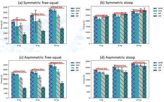 For the free-squat, similar tendencies regarding the influence of the support modes on metabolic energy consumption, as found previously for compression forces, i.e., the strongest reduction with OM, followed by AM, SPM, and WPM, were recorded (mean difference of metabolic energy reduction between WPM and OM, squat motions: 1634 ± 63 J; stoop motions: 133 ± 15 J) (Figure 9). A notable exception was the symmetric free-squat with the 4 and 8 kg weights, in which the SPM supported more than the AM, but this had a high standard deviation (Figure 9).