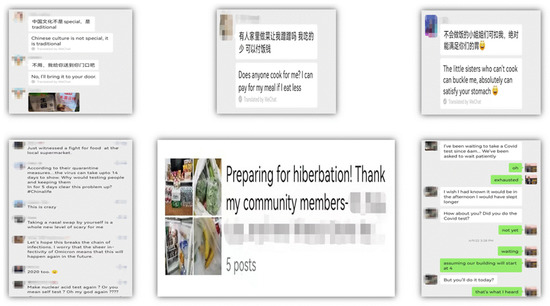 We adopted an observational research approach [37]. Accordingly, we conducted direct and participant observations via WeChat, which is the most widely used social media messaging app in China. A total of 1558 WeChat accounts were divided into seven chat groups (see Table 1). We developed fieldnotes through our personal reflections, observations, and written and textual data such as media sources, email communications, and online meetings (e.g., Zoom and Tencent). These data sources were utilized to develop the contextual background for each theme. We also captured approximately 300 screenshots, which include but are not limited to sources of information from international diplomatic communities, compound committees, and volunteering-groups, as well as WeChat communications among various individuals. Some of the individual texts (personal communication) were also collected from those individuals. We mutually discussed and selected the most appropriate screenshots. Given this, we excluded texts that are too political, inappropriate, or vulgar (see Figure 1) [38].