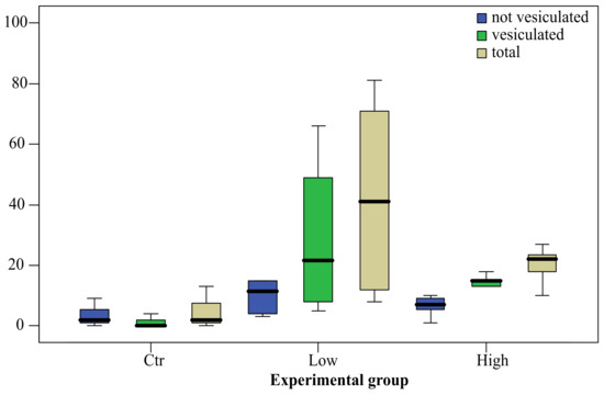 Box plot of the absolute follicles number (in ordinate) according to morphology (not vesiculated, vesiculated and total) and the PFOA exposure group (Ctr, unexposed; Low concentration, 200 ng L−1 PFOA; High concentration, 2 mg L−1 PFOA). The bold line in the box represents the median and divides the box into a lower and upper quartile (25 percentile). The whiskers represent the upper and lower outer quartiles and, as a consequence, the upper and lower 50 percentile starting from the median.