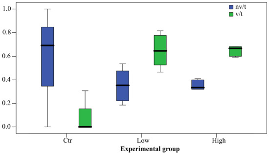 Box plot of the relative follicles number (in ordinate) according to morphology (nv/t = not vesiculated/total, v/t = vesiculated/total) and PFOA exposure group (Ctr, unexposed; Low concentration, 200 ng L−1 PFOA; High concentration, 2 mg L−1 PFOA). The bold line in the box represents the median and divides the box into a lower and upper quartile (25 percentile). The whiskers represent the upper and lower outer quartiles and, as a consequence, the upper and lower 50 percentile starting from the median.