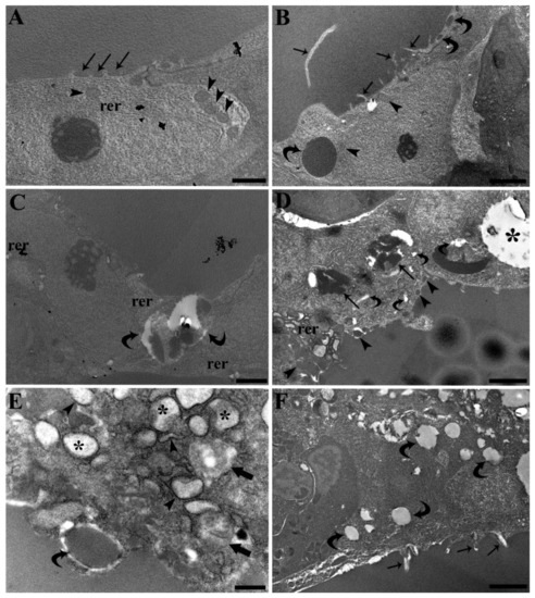 Transmission electron micrographs of ultrathin sections of common carp kidney. (A) A thyroid flattened pavement cell of an unexposed carp shows small colloid pinocytic caveolae (arrows), small mitochondria (arrowheads) and thin rough endoplasmic reticulum cisternae (rer). Scale bar = 1 μm. (B) Thyroid cuboidal cells in an unexposed carp display elongated cellular projections (arrows) and vesicles suggestive of colloid endocytosis (curved arrows). Mitochondria are also visible (arrowheads). Scale bar = 2 μm. (C) Phagolysosomes (curved arrows) and enlarged rough endoplasmic reticulum cisternae (rer) are appreciable in a cuboidal cell of an unexposed carp. Scale bar = 1 μm. (D) Thyroid cuboidal cells of a carp exposed to 200 ng L−1 PFOA display enhanced phagolysosomes formation (arrows), colloid endocytosis (arrowheads), enlargement and fragmentation of rough endoplasmic reticulum cisternae (rer), cytoplasm vacuolation (asterisk) and rarefaction (curved arrows). Scale bar = 2 μm. (E) The enlargement and fragmentation of rough endoplasmic reticulum cisternae are appreciable in a thyroid cuboidal cell of a carp exposed to 200 ng L−1 PFOA. Flocculent material is appreciable inside the cisternae (asterisks) and the persistence of ribosomes is a remarkable feature (arrowheads). Endocytized colloid (curved arrow) is also visible along with areas of cytoplasm rarefaction (arrows). Scale bar = 0.5 μm. (F) Thyroid cuboidal cells of a carp exposed to 2.0 mg L−1 PFOA display impressive cytoplasm vacuolations (curved arrows) and cellular projections (arrows). Scale bar = 2 μm.