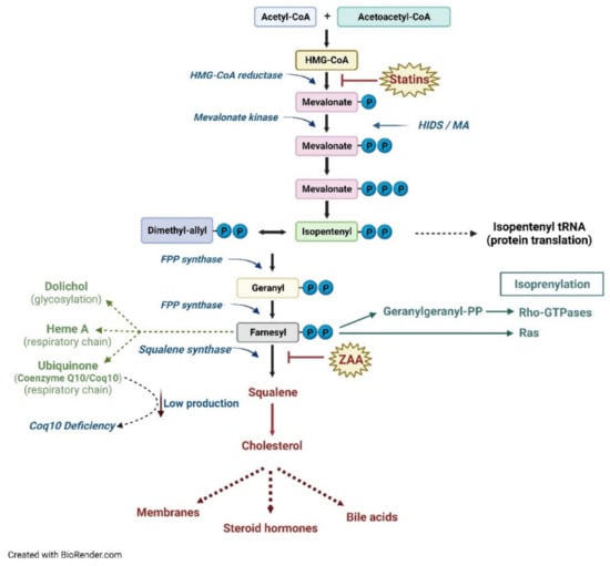 The manipulation of the metabolic pathway of cholesterol by inhibitors is aimed at regulating the synthesis of the final product. The blocking of activity of the HMG-CoA reductase and the FPP by inhibitors is focused on acting specifically at different levels of the pathway to counteract the overproduction of cholesterol. The mechanisms implemented by these compounds, which are the basis of the pharmacological active principles commonly used in the treatment of hypercholesterolemia such as statins and bisphosphonates, have highlighted transduction pathways′ signals triggered by the block of the metabolic pathway. One of the most important regulatory mechanisms is undoubtedly the reduction of regulatory proteins that bind GTP through the blocking of the production of farnesyl-pyrophosphate. The main substrates of post-translational prenylation modifications are represented by G proteins such as Rho and Rac, which function as molecular switches and, through the transduction of extracellular signals, act on cell survival, growth, and programmed cell death. These inhibitors also act at the endothelial level through the upregulation of nitric oxide synthase, and this system is certainly the basic mechanism to counteract the formation of atherosclerotic plaque. The prenylation defects are considered responsible for the inflammatory process owing to the deficiency of the intermediates of the metabolic pathway such as isoprenoids. This condition is the basis of the pathogenesis of rare pediatric diseases such as MKD, the most severe form of which experiences a significant state of neuroinflammation and clinically manifests itself with a psychomotor delay in patients. The neuroinflammatory response is characterized by a series of changes that mainly involve the role of microglial cells in the maintenance of cerebral homeostasis. An imbalance at this level involves activation, by specific brain mediators, of microglia that is in turn responsible for amplifying and maintaining the inflammatory state. Moreover, oxidative stress has been shown to be one of the main causes of mitochondrial dysfunction, resulting in alteration of ATP production, as in Coq10 deficiency.