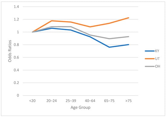 The odds ratio for gender indicates that female drivers are more likely to be involved in a crash seeking post-crash medical services. Figure 1 shows the odds ratio for different age groups in each of the three states. Odds ratios suggest that drivers in the age category of 20–24 years are more likely to be involved in a crash resulting in medical services. This trend decreases with age before increasing for older groups. The inflection point differs by state. In Kentucky and Ohio, the reversal occurs for drivers 65 and older, while in Utah, the threshold is 40 years of age.