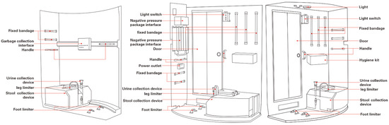 A controlled experimental environment was designed and built based on the hygiene area of a space station with support from the China Astronauts Centre (Figure 1). Based on the reports on the International Space Station by Messerschmid and Borrego [4,46,47], the various functional elements were optimised to provide an integrated experimental system of the hygiene area in the space station in order to ensure reliability and accuracy of the experiment. This simulated environment included four subsystems: temperature and humidity monitoring, illumination system, physiological monitoring, and urine/stool collector simulator.