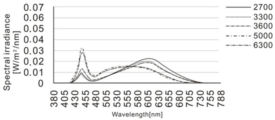 Spectral distribution of the light in the test room at nominal CCTs of 2700 K, 3000 K, 3600 K, 5000 K and 6300 K.